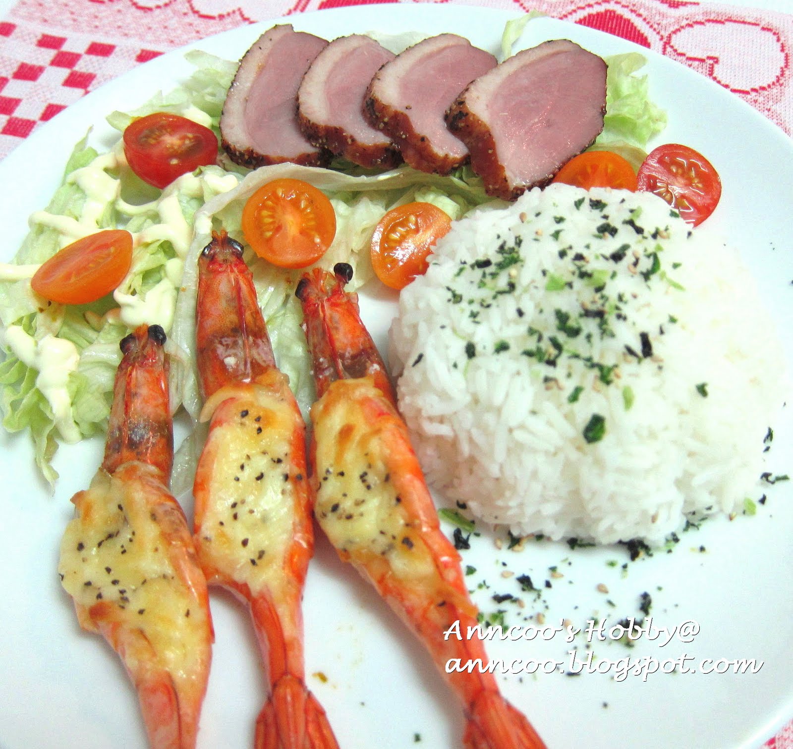In my main dish, I served baked cheese prawns with rice, smoked duck (store bought) and tomatoes, lettuce with mayo.