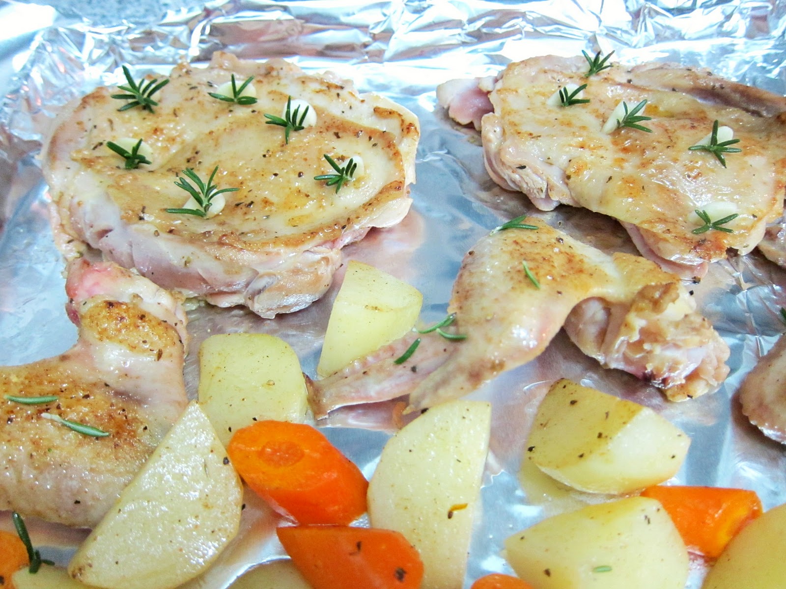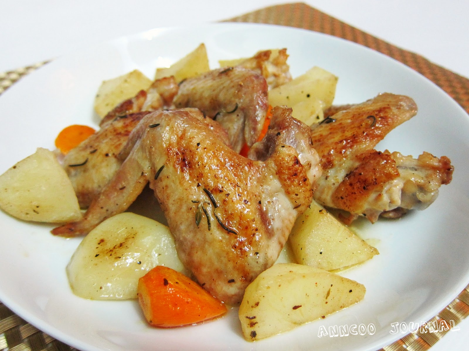 - Put chicken thighs, chicken wings, carrots and potatoes in a baking tray or pan, pour the remaining olive oil from frying pan. Bake in oven for about 20 mins or fully cooked.