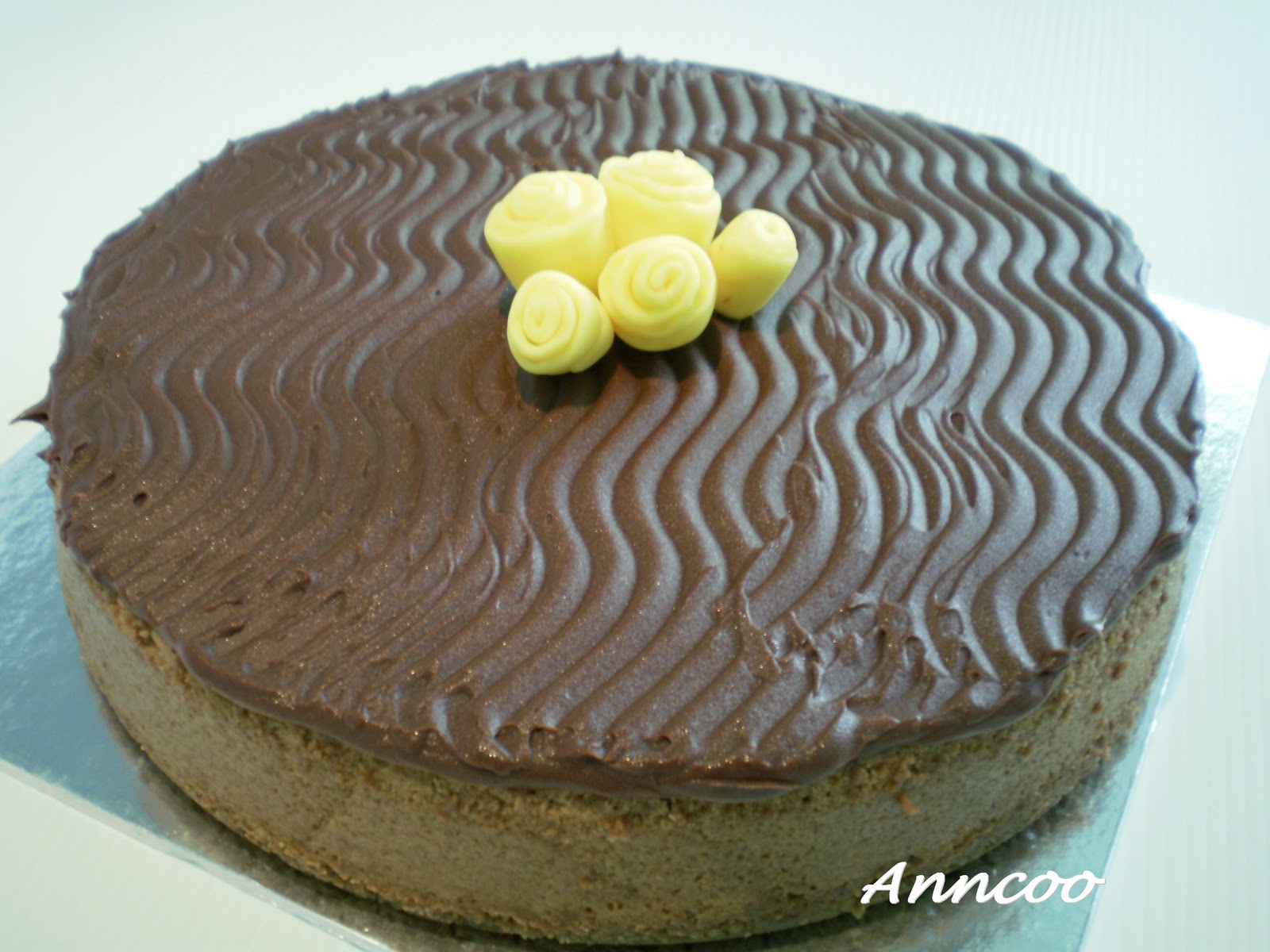 Steam bake at 160C for about 50 mins.Leave to cool and spread chocolate ganache on top of cheese cake.