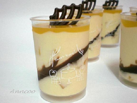 Pour mango mousse to cups to half , add some mango cubes (let it semi-set in fridge) and use piping bag to pipe the chocolate ganache on top follow by the 2nd layer of mango mousse. Put mango mousse in fridge to set for about one hour.
