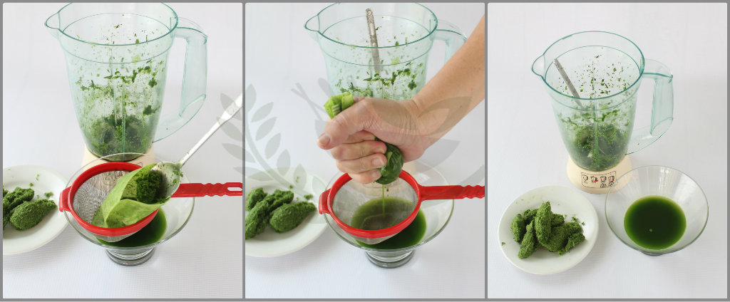 - Place blitzed pandan into a small disposable soup bag and squeeze out the pandan juice.
