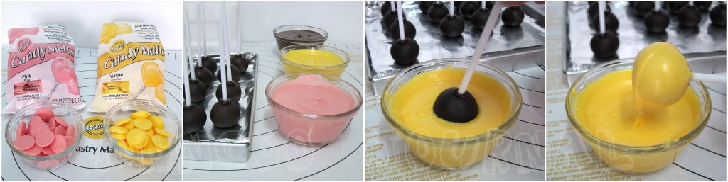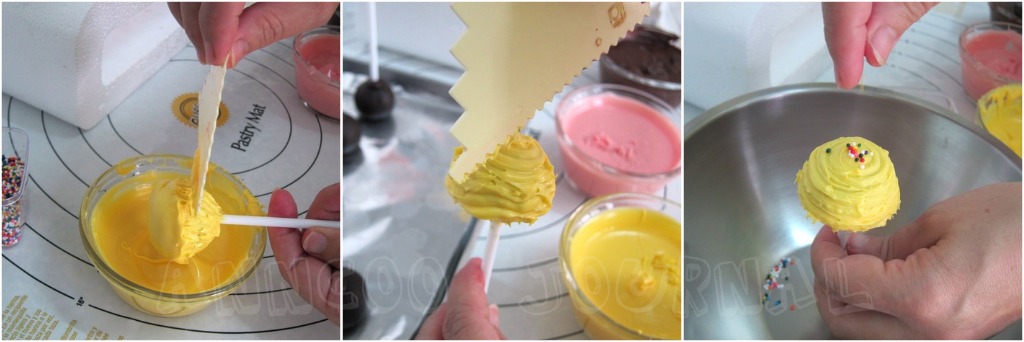 - Carefully insert the cake ball into the candy/chocolate coating by holding the lolliop stick and rotating until covered.
