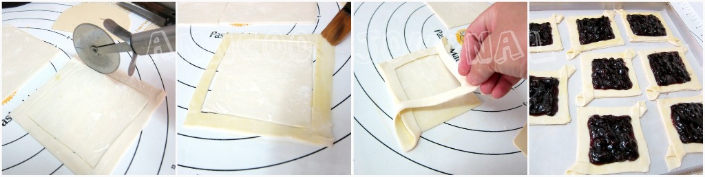 - Place puff pastry sheet on a lightly floured table top or pastry mat(sprinkle some flour on top if pastry is still wet) and use pizza cutter to cut pastry sheet into 4 equal square sheets.