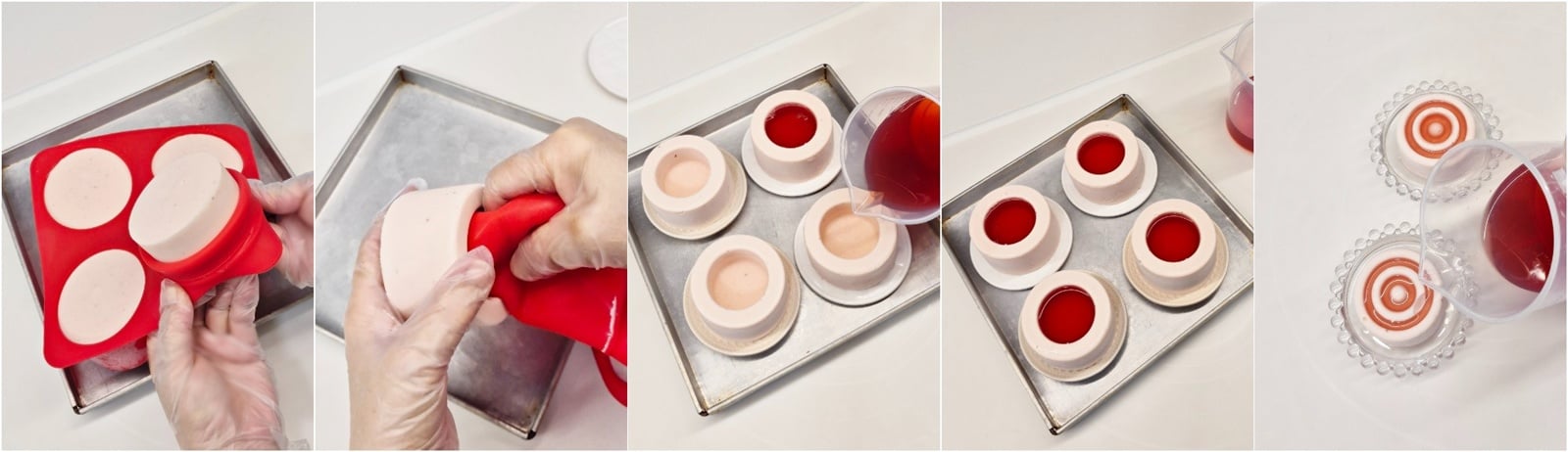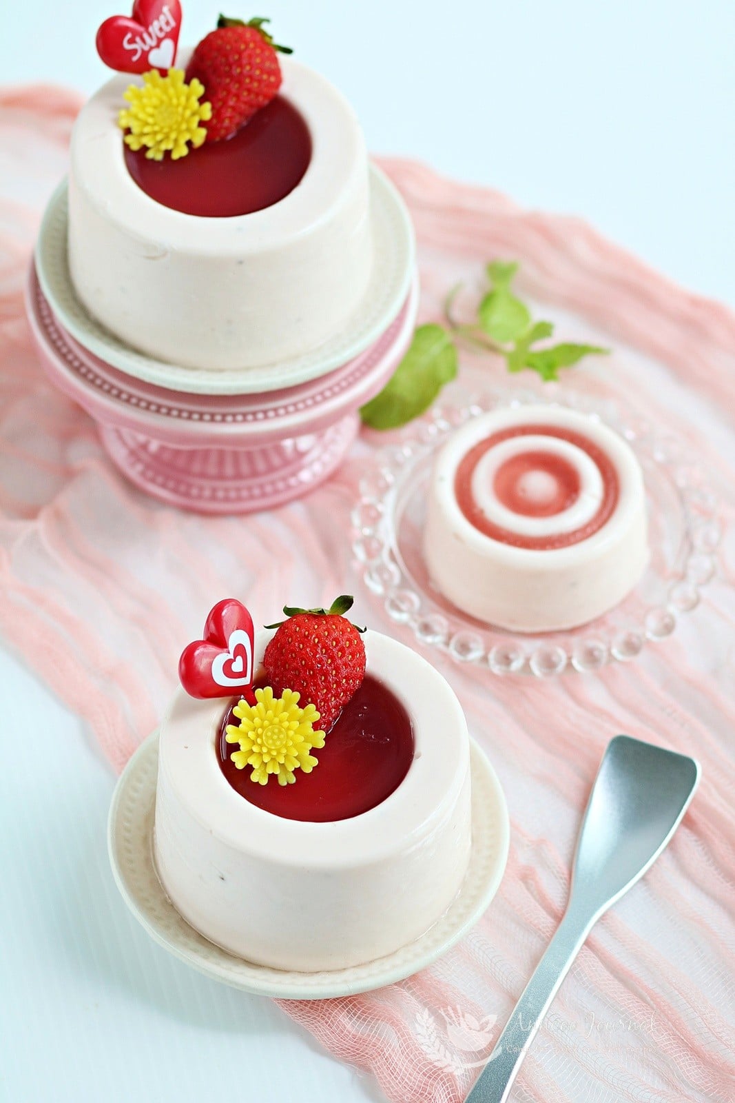 - 从冰格处取出乳酪慕斯, 脱模放在碟子上, 倒入草莓水慕斯杯中, 收进冰箱冷藏数小时即可享用.