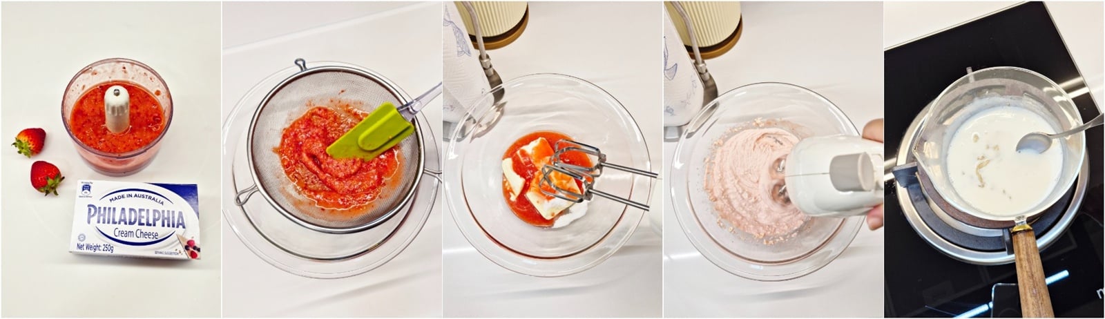 - Place cream cheese and sugar in a mixing bowl. Pass strawberry puree through a sieve and beat well mixture to smooth.