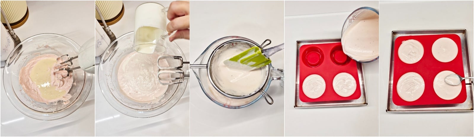 - 过滤乳酪混合物, 才倒入凹凸摸具. 然后收进冰格处冰冻最少4小时或过夜.