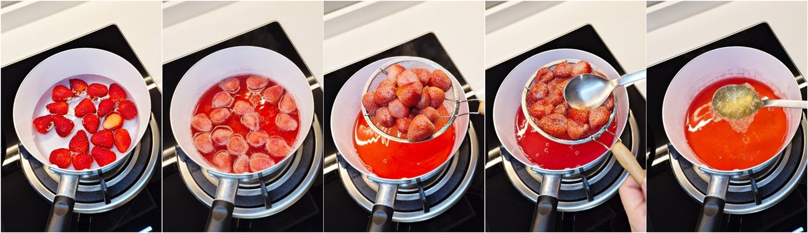 - 草莓果冻 – 锅中加热清水和砂糖, 放入草莓. 底火煮滚约2-3分钟至液体变红色即可捞起. 草莓放在滤网轻轻压出多余的水分.
