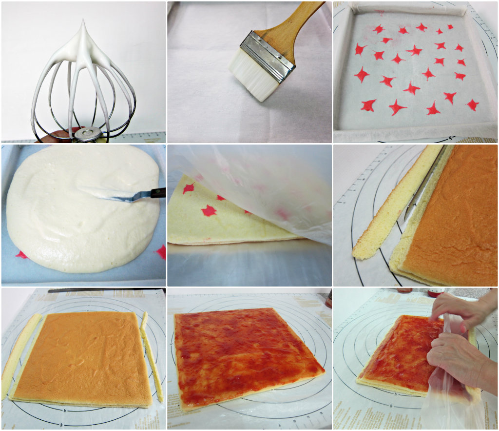 - Turn cooled sponge onto a plastic sheet. Gently peel off baking sheet from the bottom of sponge and invert the sponge with skin facing up. Trim one end on a 45 degree angle and trim the other end on a similar angle. Spread an even layer of strawberry jam over top of sponge.