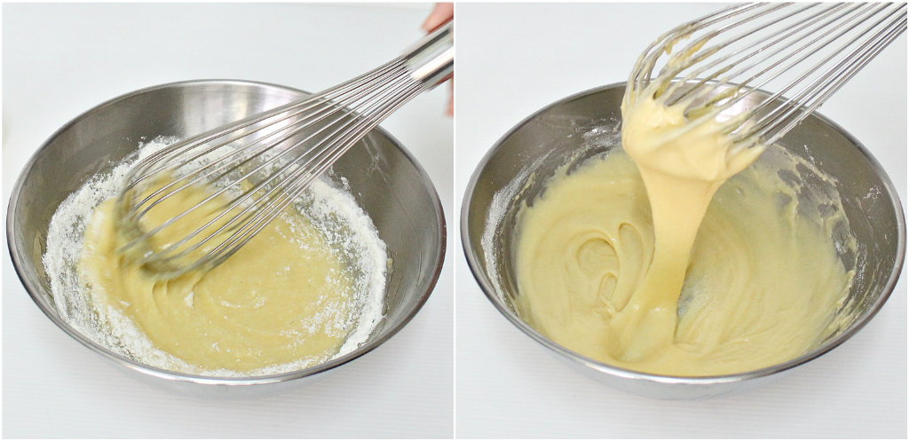 - Then gradually add in sifted flour and baking powder into batter mix till combined and becomes a thick paste.